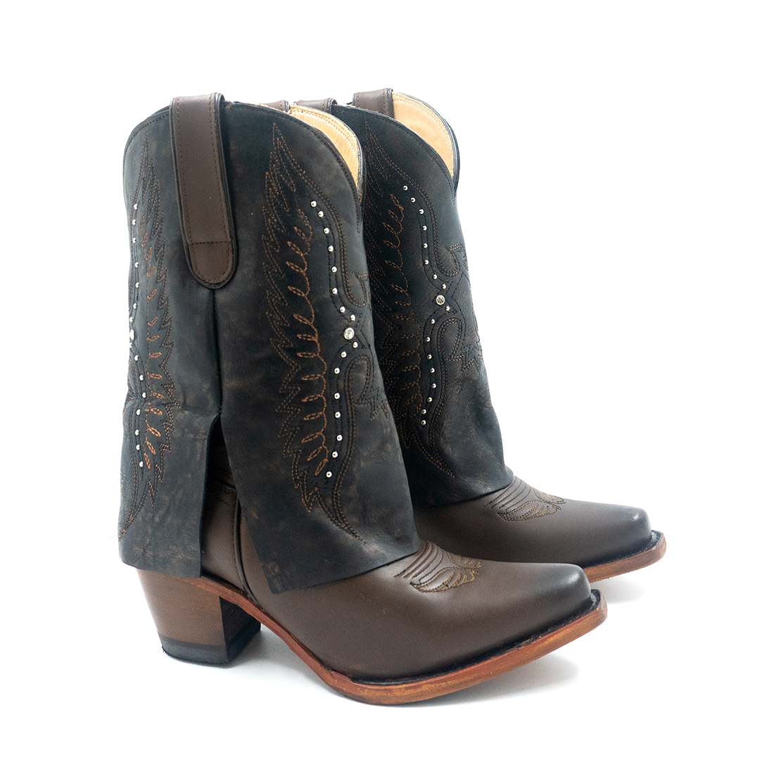 Con su combinación en tonos café y negro, bordado elegante y destellos de herraje, este modelo está hecho para la mujer que no ocupa hacer ruido para imponer presencia. Firme, bonita y con ese estilo de rancho que se mira de lejos.
